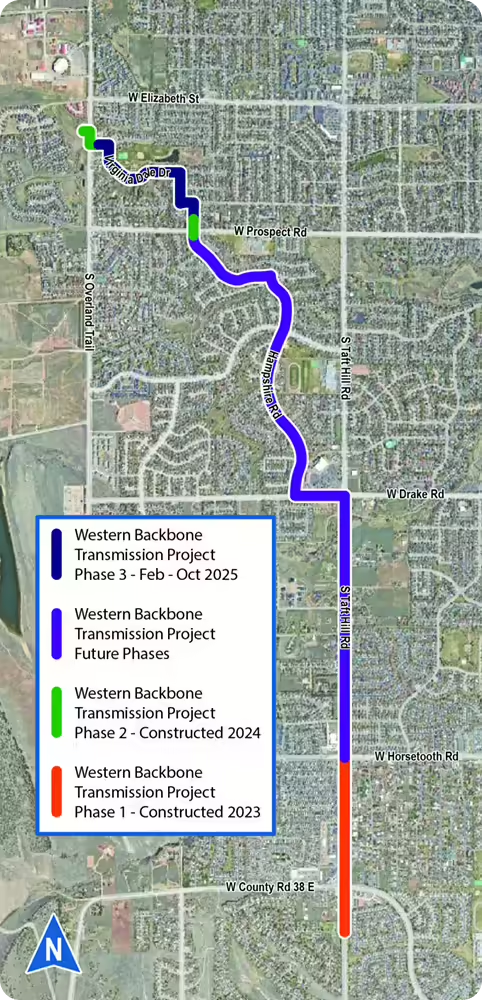 Phase 3 of the Western Backbone project is anticipated to begin in the first part of 2025. This phase will take place between Overland Trail and Prospect Road along Pleasant Valley Road, Virginia Dale Drive. Wildwood Road, Lake Street and Cedarwood Drive. See the map for specific timeframes. The construction schedule is an estimate based on ideal weather conditions. Weather and other delays to this schedule may occur.