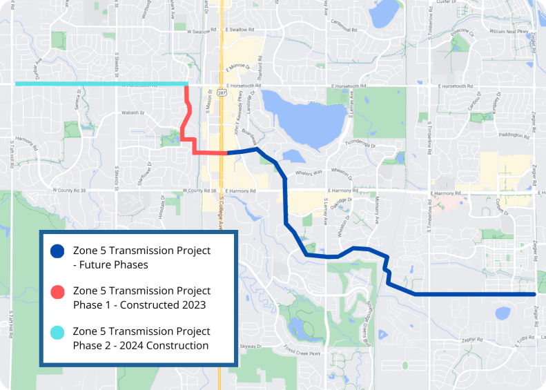 The Zone 5 Project is a multi-phase project stretching approximately 8 miles across the City of Fort Collins. Existing FCLWD infrastructure is undersized for current and future flow needs, resulting in dependence on pump stations and alternative water delivery sources. The Zone 5 project will increase hydraulic capacity and improve overall system performance and reliability. The completion of this project is critical to continue to deliver reliable and affordable water to our customers. During phase 2 of the project we will be installing a 24″ water line along Horsetooth Rd. from Manhattan Ave. to Taft Hill Rd.